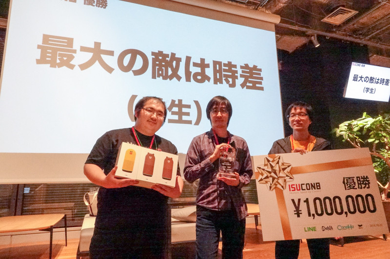 優勝チームは、学生チームの「最大の敵は時差」でした!学生1位でもあるので、合計130万円というISUCON史上最高額の賞金となりました。なお、副賞として主催であるLINE株式会社よりスマートAIスピーカー Clova Frindsをお贈りしました。
