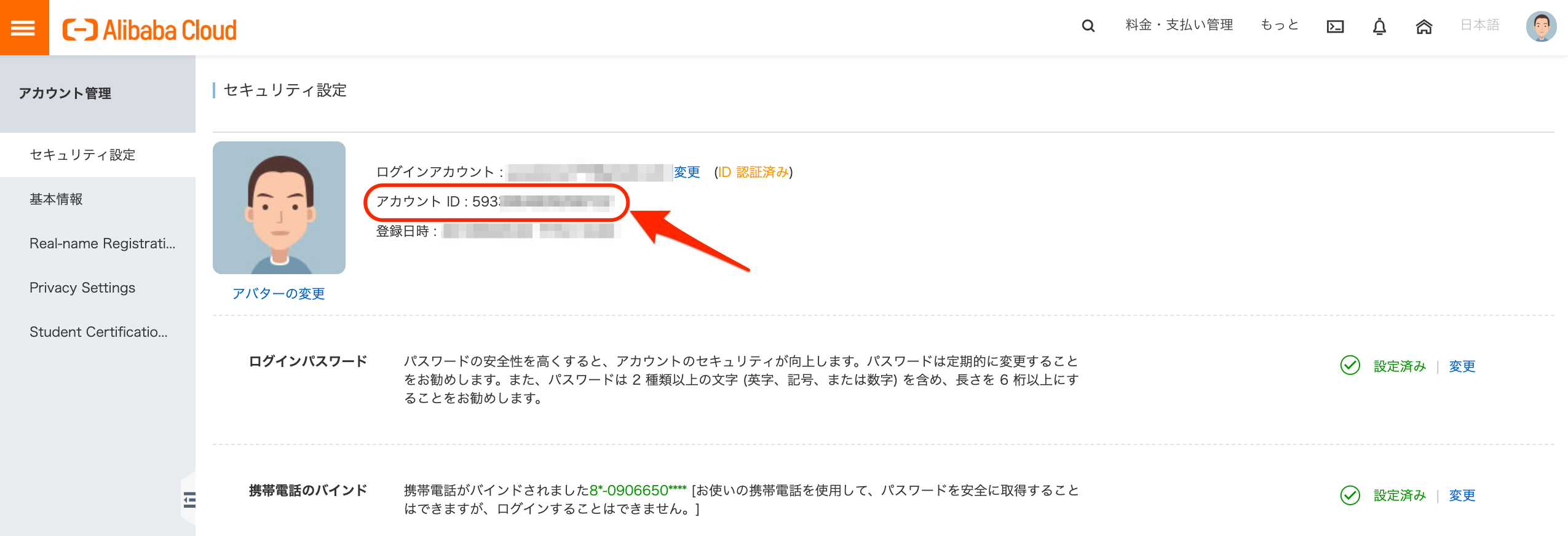 Alibaba Cloudにログインして右上の「マイアカウント」→「アカウント設定」を選択してください。