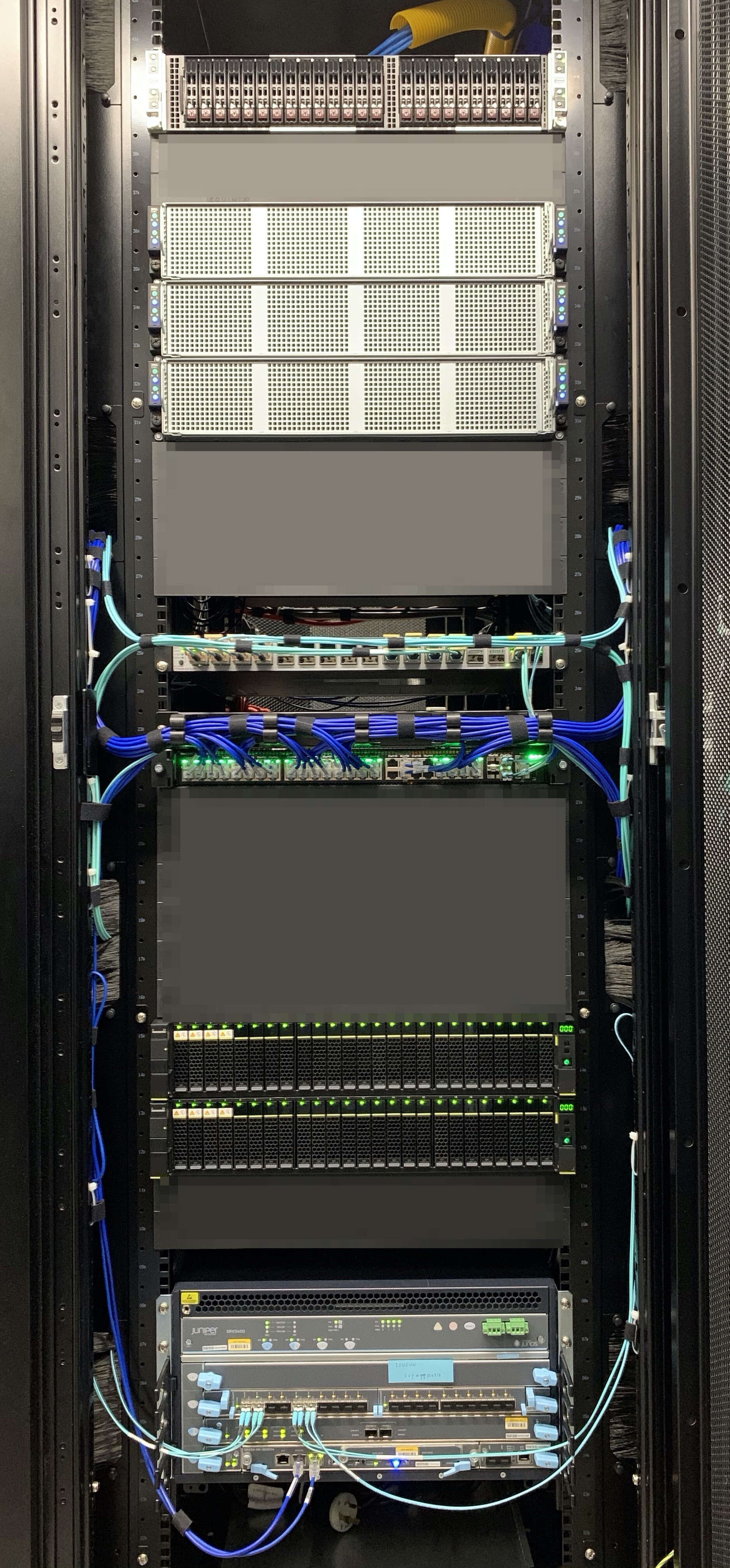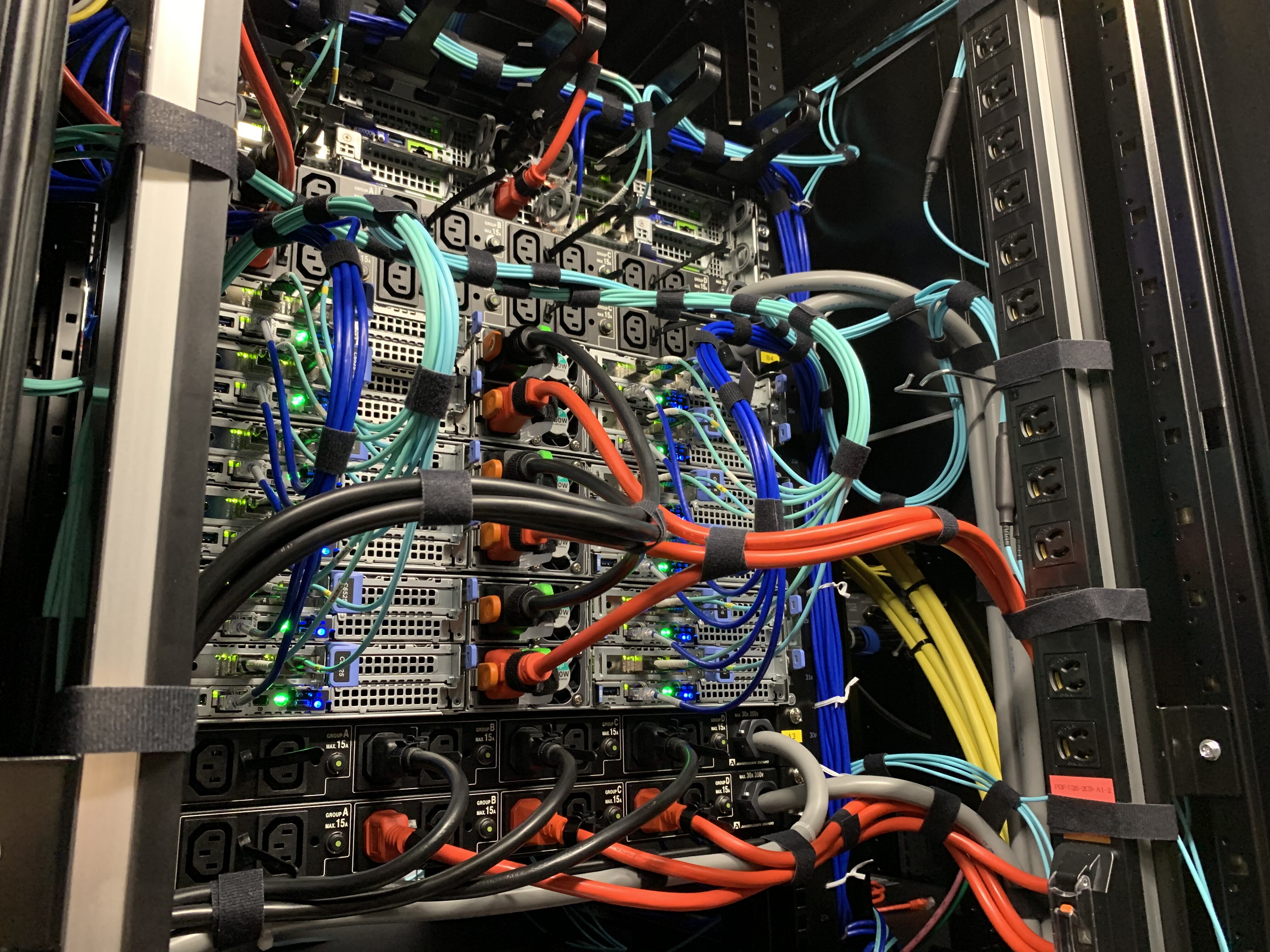 上記の物理機材を弊社管理のラック2つに収容しました。当初は1ラックの予定だったのですが、参加者全員がフルにCPUを利用した場合にも電源容量が足りるよう万全を期すために2ラックに収容しました。こちらは実際のラックの写真です。弊社DCチームは普段からとても綺麗なケーブリングをされているのですが、「のちのちインターネットに公開するので写真を撮りたい」という話をしたところ気合が入り最高のケーブリングになりました。