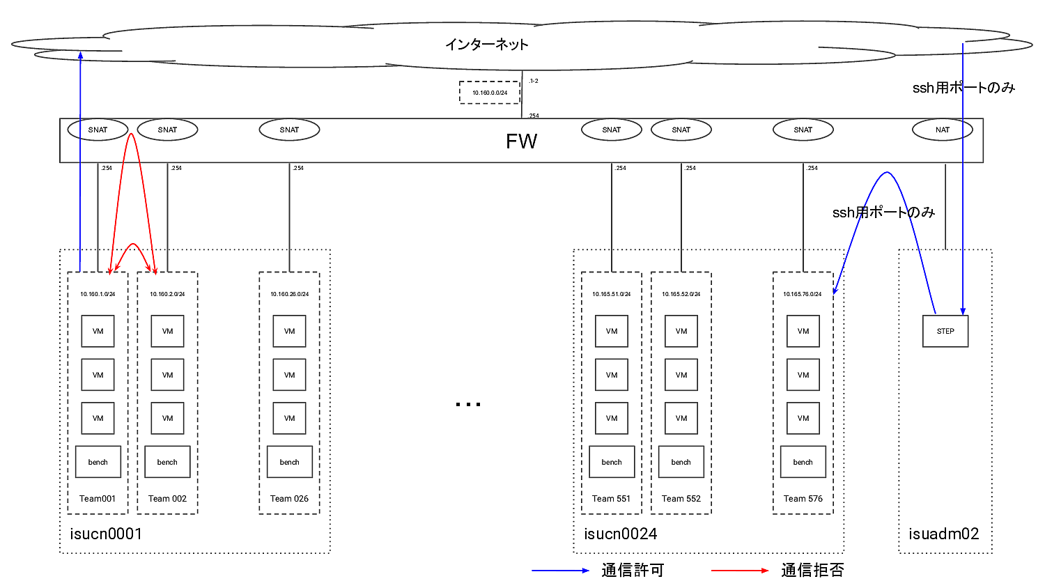 今回はSSHの入口のためだけのVMを各チームごとに用意しておき、インターネットからそのVMを経由してISUCON環境にログインしていただく方式を採りました。SSH踏み台と呼ばれる古来から存在する方式なのですが、近年クラウドの隆盛によって使ったことがないという方も多くいらっしゃったようでした。実際に予選開催中にはSSH接続に関するお問い合わせを数件いただきました。