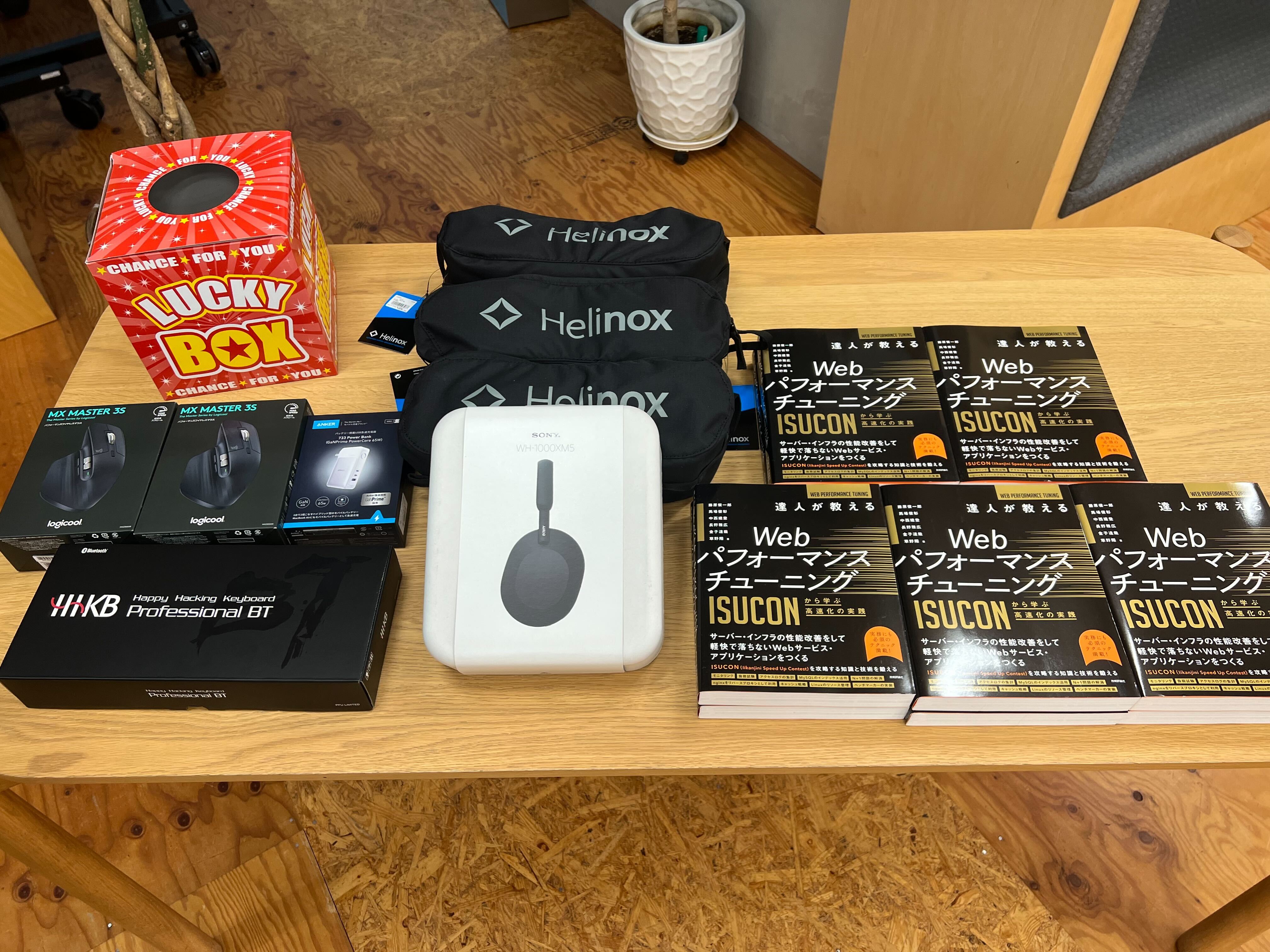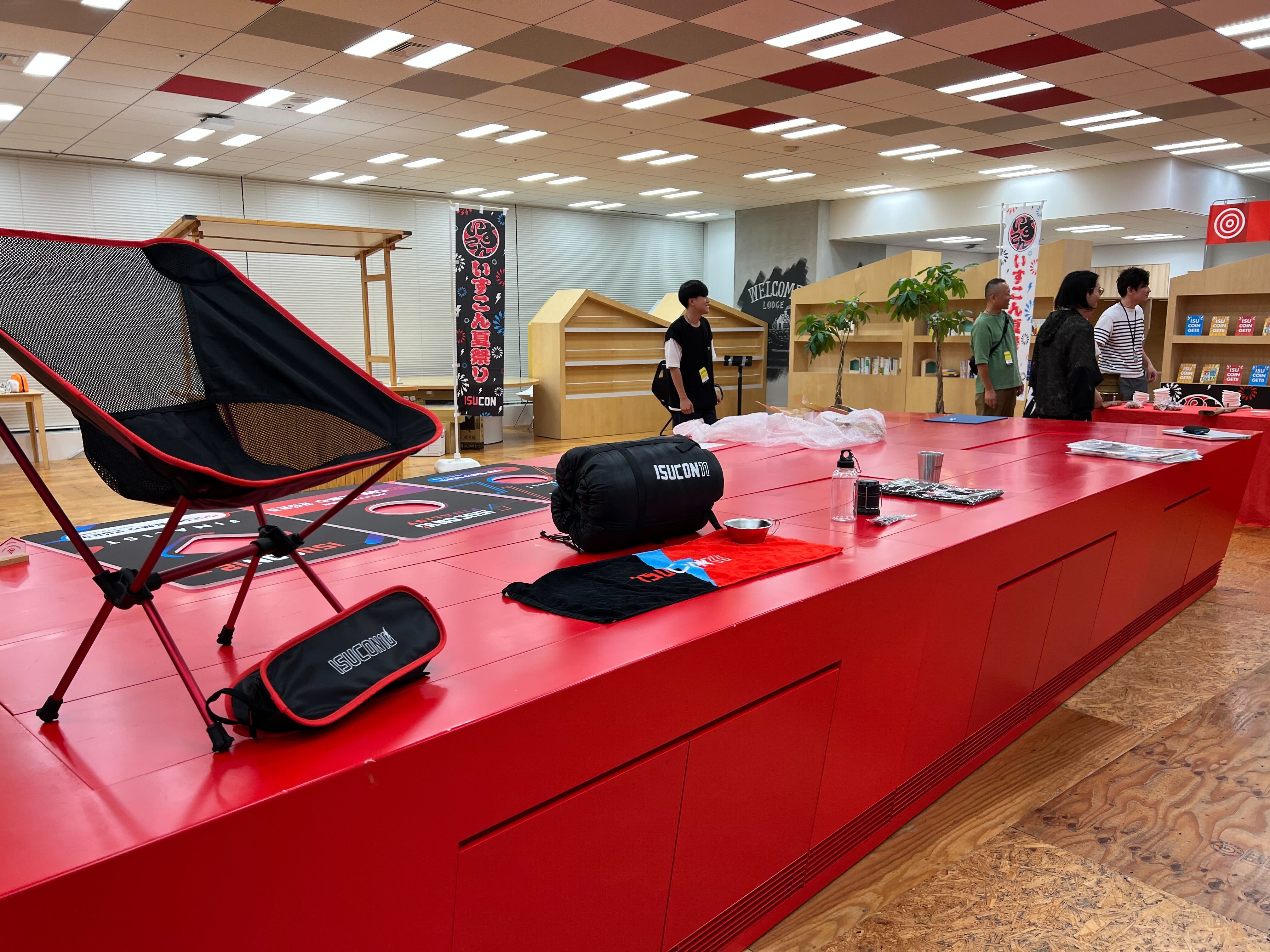 過去の大会での個人スポンサーグッズも展示され、それぞれの年の特色やトレンドを感じ取ることができました。たとえば、ISUCON10ではシンプルなマグカップや椅子が、ISUCON12では多機能なライトや便利なカトラリーセットが提供されました。