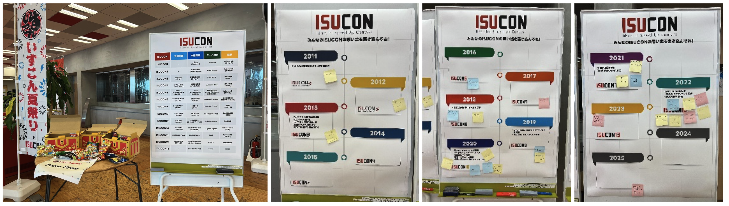 イベントに訪れた参加者は、展示エリアを歩きながらISUCONの魅力的な歴史を体験できました。ここでは、ISUCONの成長を追体験できるように、過去の問題や出題チーム、ISUCONでの実施内容を年表的に整理し、一目でその進化を感じることができました。